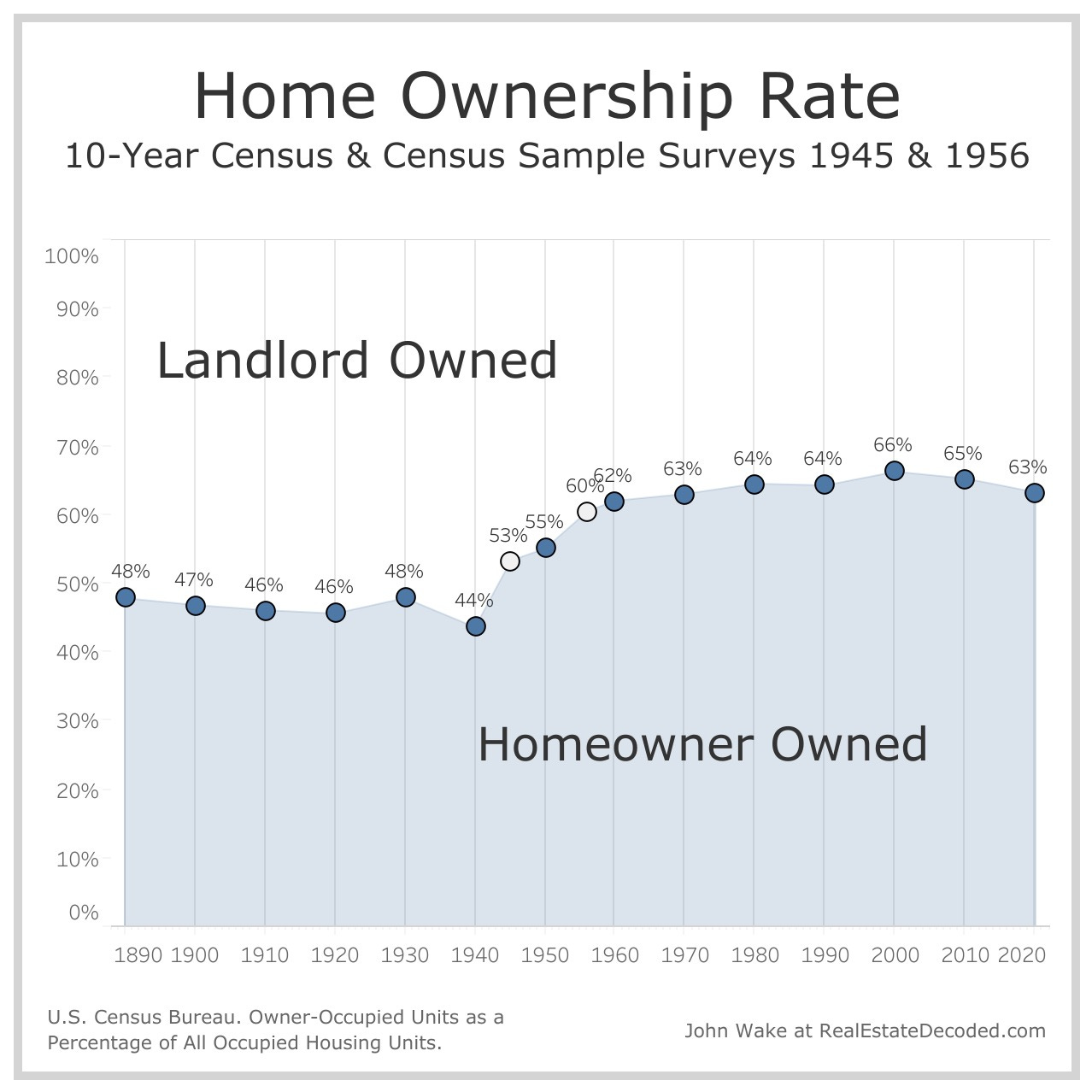 No, home ownership didn’t increase the fastest right AFTER World War 2. The fastest increase in U.S. home ownership in the 20th century was DURING World War 2 when mortgages were at most 20 years long and down payments were at least 20%. The home ownership rate increased 10 percentage points from 1940 to 1945 – from 43.6% to 53.2% – according to research by Daniel Fetter of Stanford.