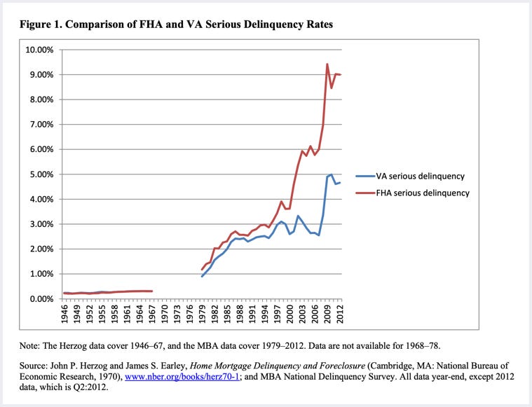 Source: A lot of the information on FHA and VA mortgages here I learned from Ed Pinto at AEI, for example, here, here, here, and here.